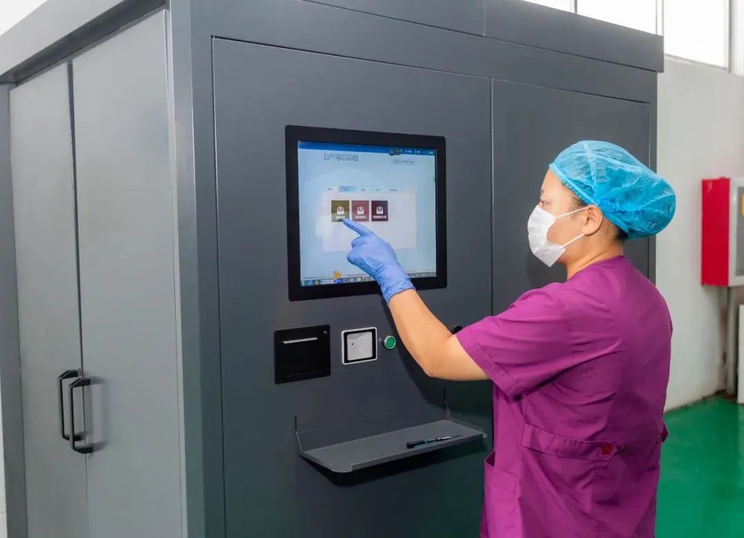 除了增加了整個中間過程的識別外,國濟尚領還研發了配套智能醫用織物堆碼機,全新的智能醫用織物堆碼機改變了傳統堆碼機只能簡單將折疊機發出的所有醫用織物堆碼到一定數量后輸送出去,不能按種類和用戶進行區分,不具備分揀能力,且因缺少折疊失敗檢測,從而造成堆碼失敗的弊端。新設備采用RFID和人工智能圖像識別技術,通過RFID標簽對不同用戶醫用織物進行分類,再由人工智能軟件判斷醫用織物的不同種類,同時判斷接收的醫用織物是否折疊良好、是否具備堆碼條件,大大增加了自動堆碼的成功率,減少人工干預的時間和次數,提高堆碼分揀效率。同時在院內,國濟尚領投放了智能醫療織物收發柜,由工作人員統一將潔凈織物投放到潔凈柜中,醫護人員可隨時刷卡或掃碼取用,經使用后,醫務人員再將使用過的醫用織物投放至回收柜中,由工作人員運回洗滌。整個環節無需進行人工交接。系統會詳細記錄下存入取出時間、人員、織物數量和種類等信息、并自動清點數量,有效對織物進行管控。